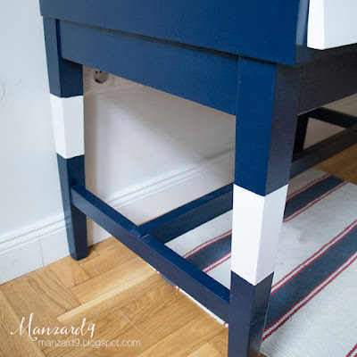 A fiókelőlapokat és a "térdvédő"-t maradék festékkel - OBI 2az1-ben selyemfényű vízbázisú zománc - festettük. Mivel kicsi, kevés felületről van szó, és volt maradék, így feleslegesnek tartottam festéket vásárolni - jól mutat, és anyagában is illik a két (fehér-sötétkék) eltérő, de tapintásra, kinézetre hasonló anyag.